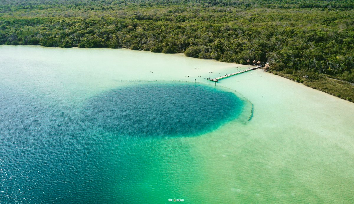 Una laguna turquesa con un cenote profundo en el centro.